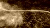 Road through the green rainforest. Aerial top view forest on misty fog morning. Ecosystem and healthy environment concept and background.