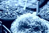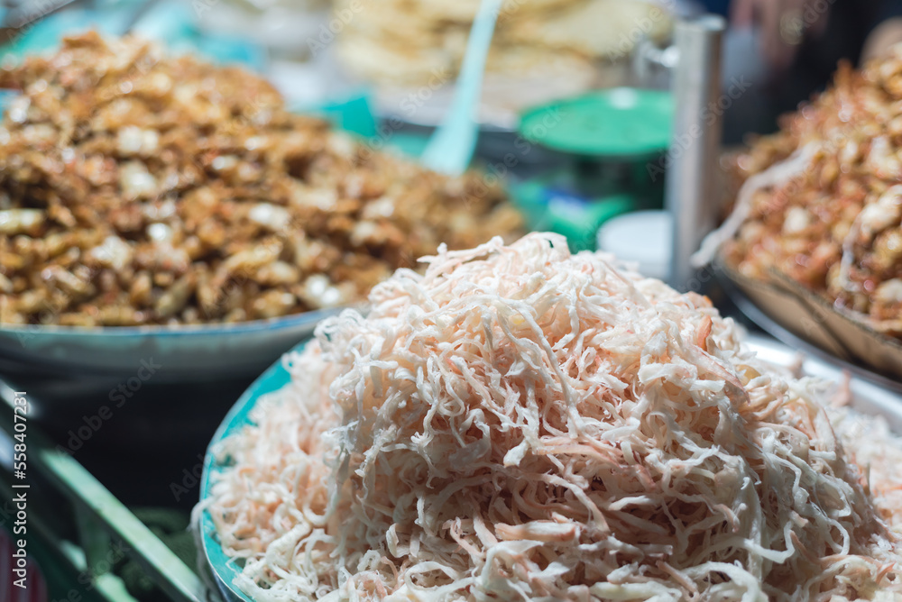 Delicious pulled squid and BBQ seasoned seafood on small vending cart at night market in Vung Tau, Vietnam