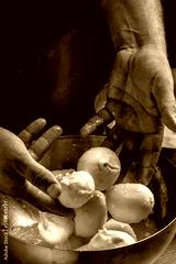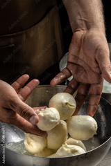 Traditional Cheesemaking, The processing Traditional Italian mozzarella, Cheesemaker, showing freshly made mozzarella