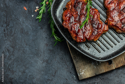 Roasted pork steaks, cutlets with rosemary and spices on a dark background. Restaurant menu, dieting, cookbook recipe top view