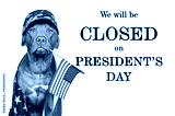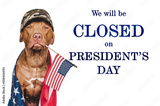 Sign that says We will be closed on President's Day. Lovable, charming puppy with the American Flag. Studio shot. Signboard layout for you store. Closeup, no people