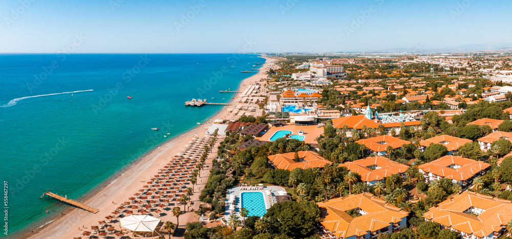 Luxury tropical hotel resort. Outdoor tourism landscape. Luxurious beach resort with bungalows in the park by the beach.