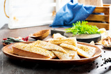 Fresh raw fish fillet with spices, pepper, salt, basil on a stone plate, top view, square
