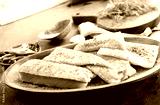 Fresh raw fish fillet with spices, pepper, salt, basil on a stone plate, top view, square
