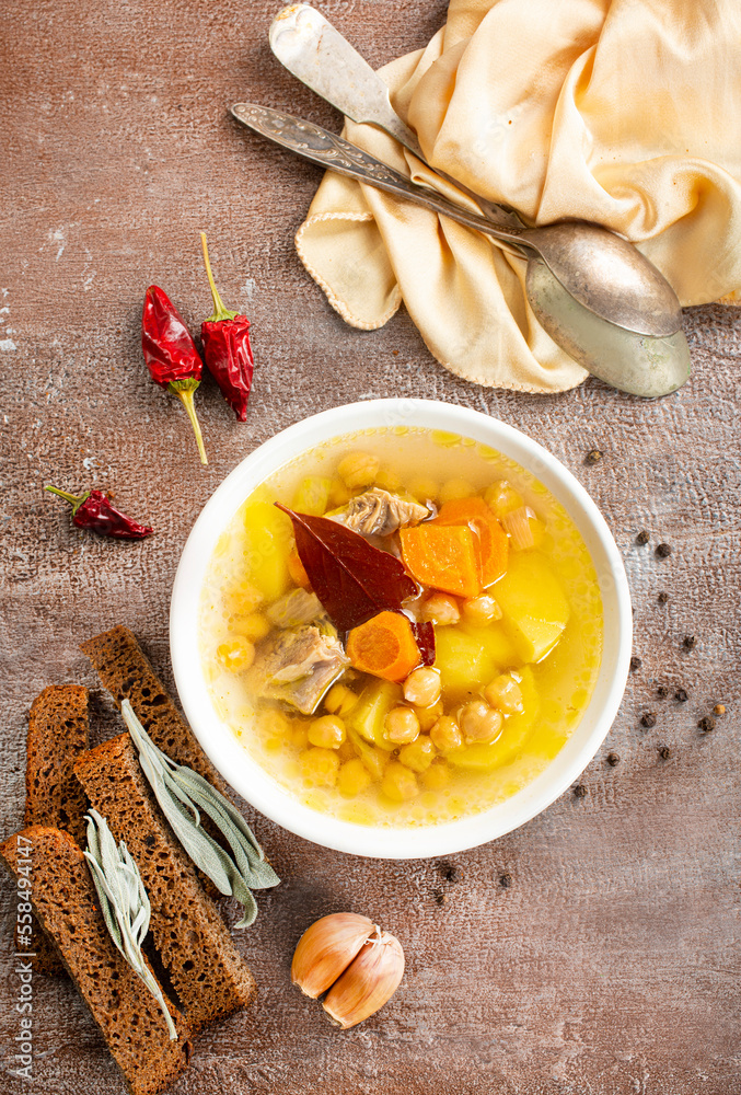 Hot spicy soup with chickpeas, onions in ceramic bowl on a dark background close-up.