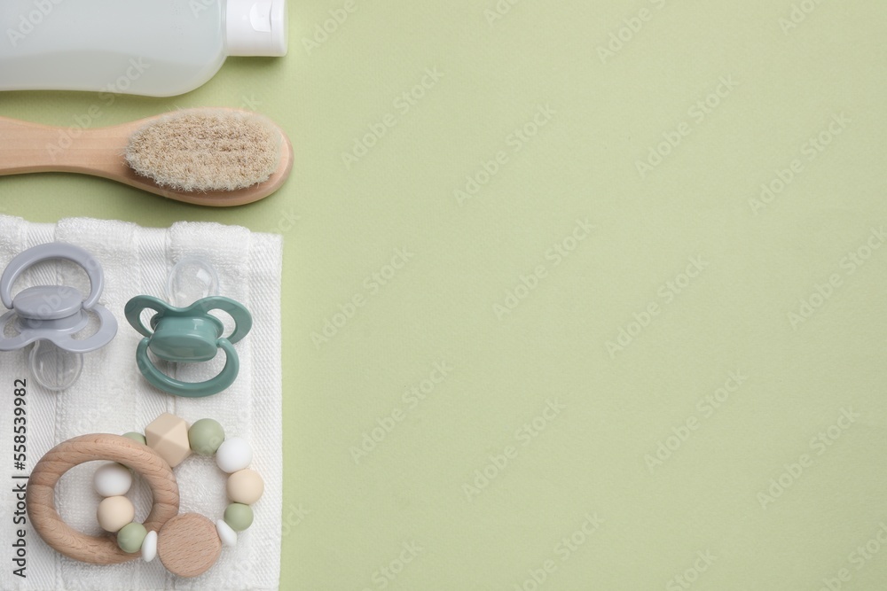Flat lay composition with pacifiers and other baby stuff on pale green background. Space for text