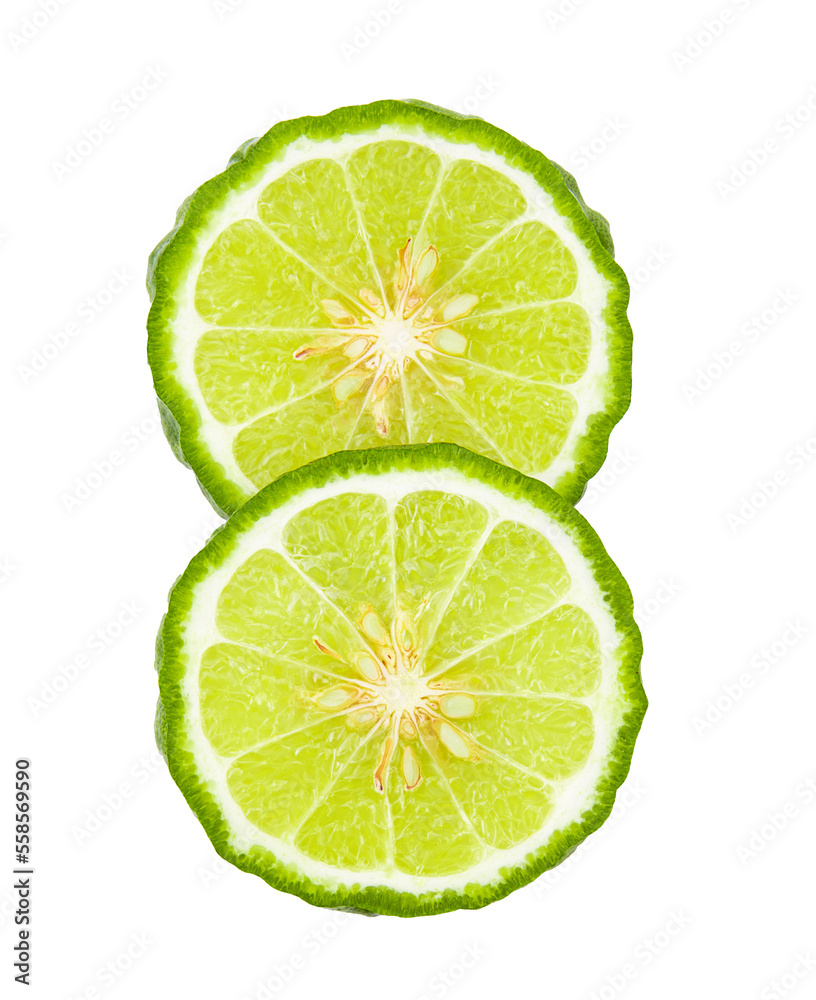 A half of bergamot or kaffir with seeds on transparent png