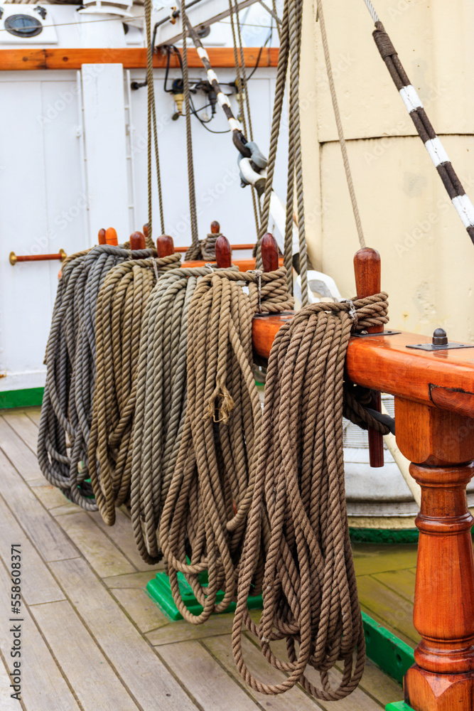 Nautical ropes on a deck of a large ship