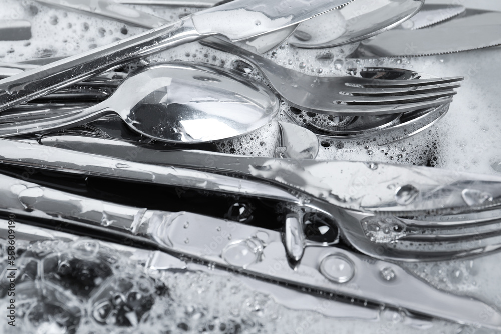 Washing silver spoons, forks and knives in foam, closeup
