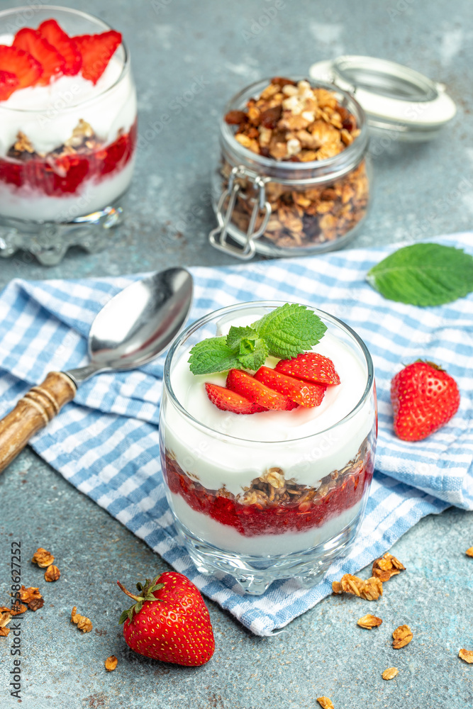 Parfait with yogurt, granola, jam, fresh berries and mint leaves in glass jar. gluten free diet, Healthy breakfast. vertical image. place for text