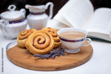 śniadanie, Słodkie bułeczki cynamonowe i kawa z mlekiem, tradycyjne szwedzkie bułeczki kanelbullar