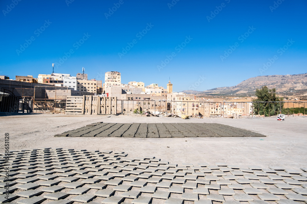 Pattern made of drying clay tiles in pottery factory in Fez, Morocco, North Africa