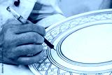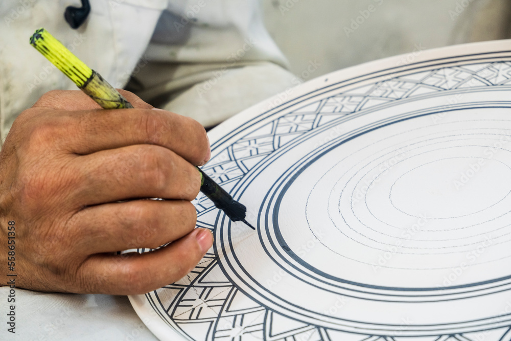Craftsman painting and decorating ceramic products in pottery factory in Fez, Morocco.