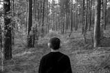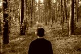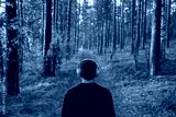 The guy listens to an audiobook and calm relax music in wireless headphones, stands with his back looking at nature in the forest.