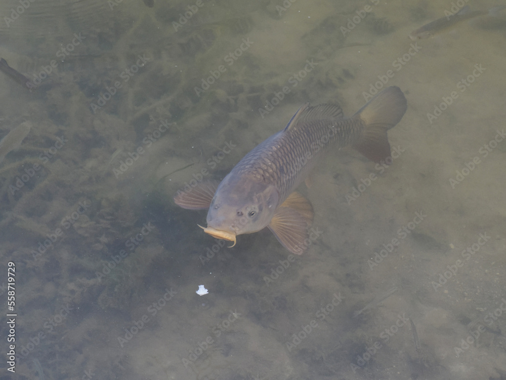 A common carp gulping air at the surface in a lake