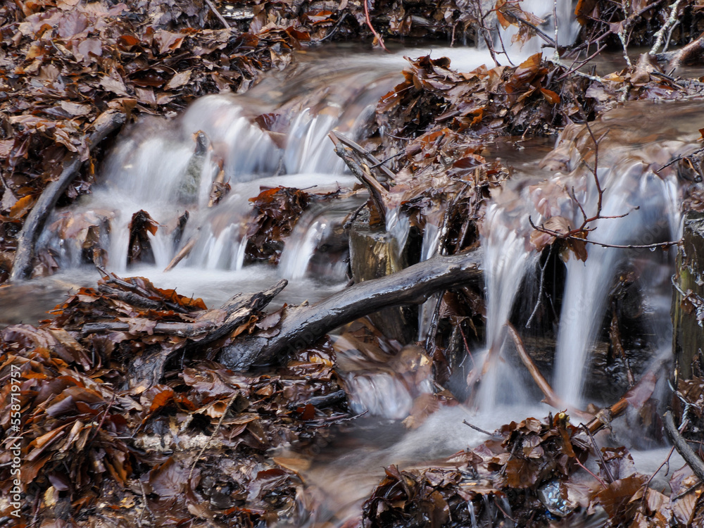 small flowing river due to snow melt forming a clean cascade with fresh cool water surrounded by vegetation mountain