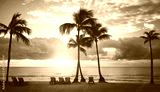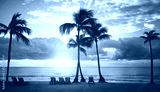 Caribbean tropical beach with coconut palm trees silhouettes at sunset, color toning applied, Mexico.