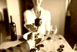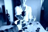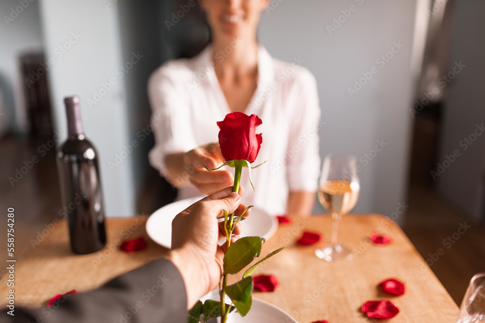 closeup of man giving woman a rose Valentine's Day gift in a romantic dinner date setting.