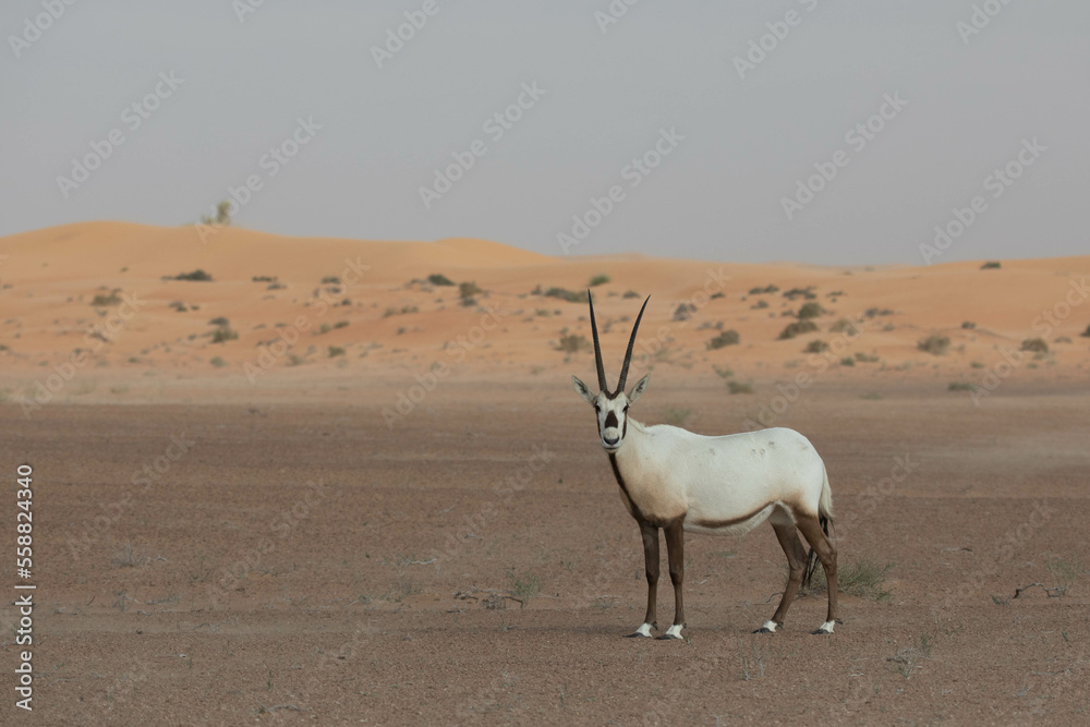 Solitary lonely arabian oryx in desert landscape looking towards the camera, making eye contact. Dubai, UAE.