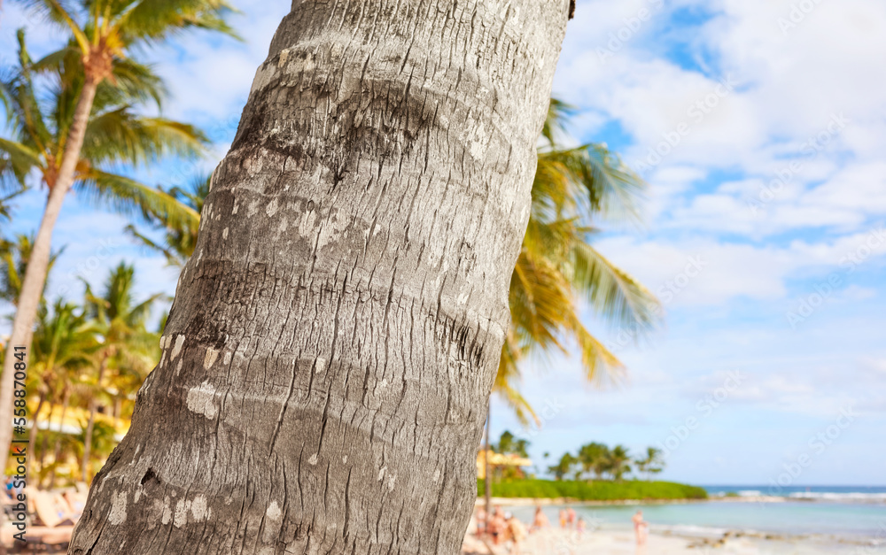 Close up of a coconut palm tree trunk at a tropical beach, selective focus.
