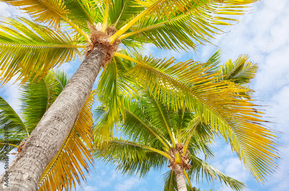 Coconut palm trees against the sky, bottom view, Yucatan Peninsula, Mexico.