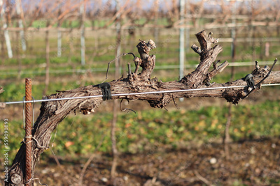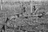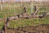 Close-up of Pruined Pinot Vineyard on winter season with many cut branches on the ground in the italian countryside