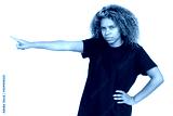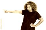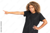 Angry African American woman pointing finger away. Portrait of displeased young female model with curly fair hair in black T-shirt looking at camera, chasing someone away. Conflict, argument concept