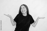 Portrait of careless young woman shrugging shoulders and smiling over white background. Caucasian lady wearing black T-shirt expressing indifference. Bewilderment concept