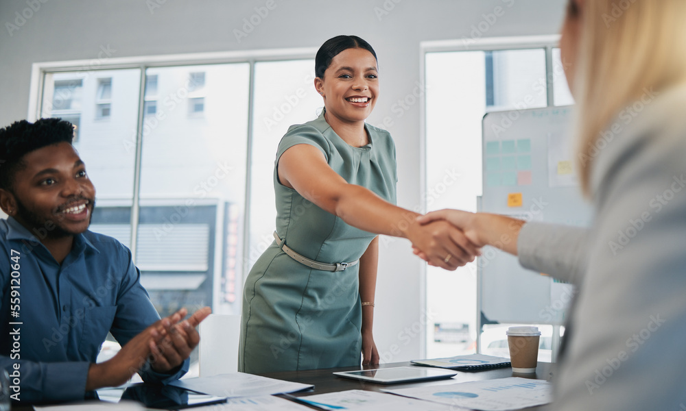 Business people, woman and handshake at meeting, planning and chart on board for target, success or goal. Corporate finance group, applause and celebration for profit, promotion or vision in New York