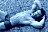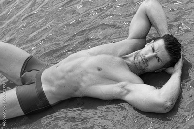 Handsome model with perfect body in sensual black and white photo shoot.