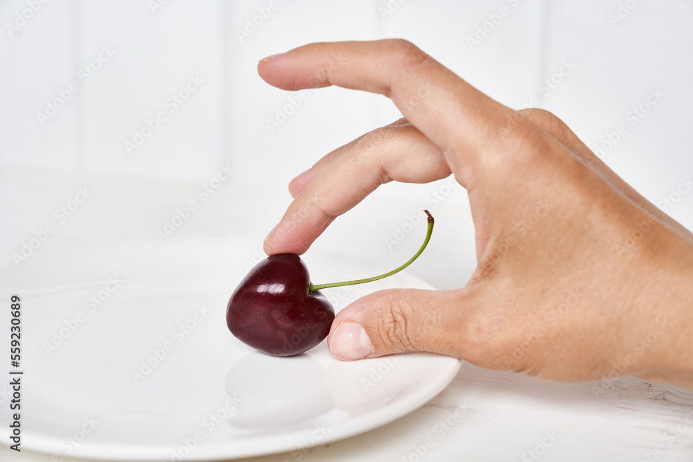 Close-up of a woman's hand holding a ripe large cherry in the shape of a heart over a white plate. The concept of healthy nutrition and vitamins. With space to copy. High quality photo