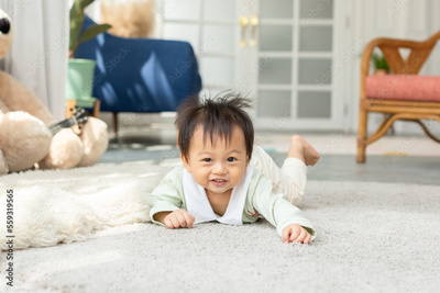 Toddler baby laying on stomach developing neck control .tummy time for strengthen baby neck and shoulder muscles.Cute infant lying crawling on carpet learn to standing and walking happiness and fun.