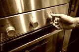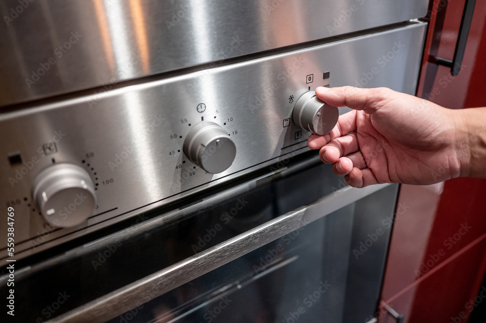 Male hand turning temperature knob of modern oven in kitchen showroom. Buying cooking appliance for domestic kitchen. Home improvement concept