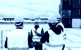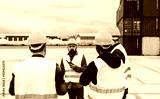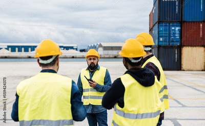 Workers controlling shipping containers at industrial port outdoor - Focus on center man face