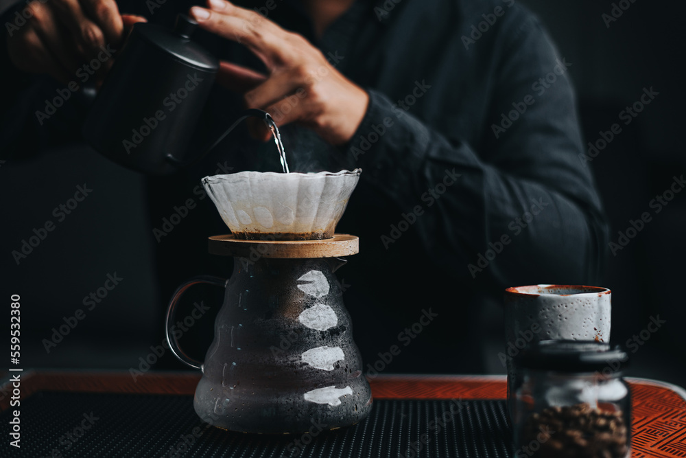 Professional barista making filtered drip coffee in coffee shop. Close up of hands barista brewing a drip hot espresso coffee, pour over coffee with hot water and filter paper in coffee cafe.