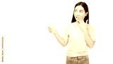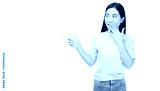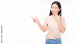 Excited young Asian woman pointing up to copy space and looking copy space with smile face and happy Pretty girl act like a satisfied product, use for advertising with isolated on white background