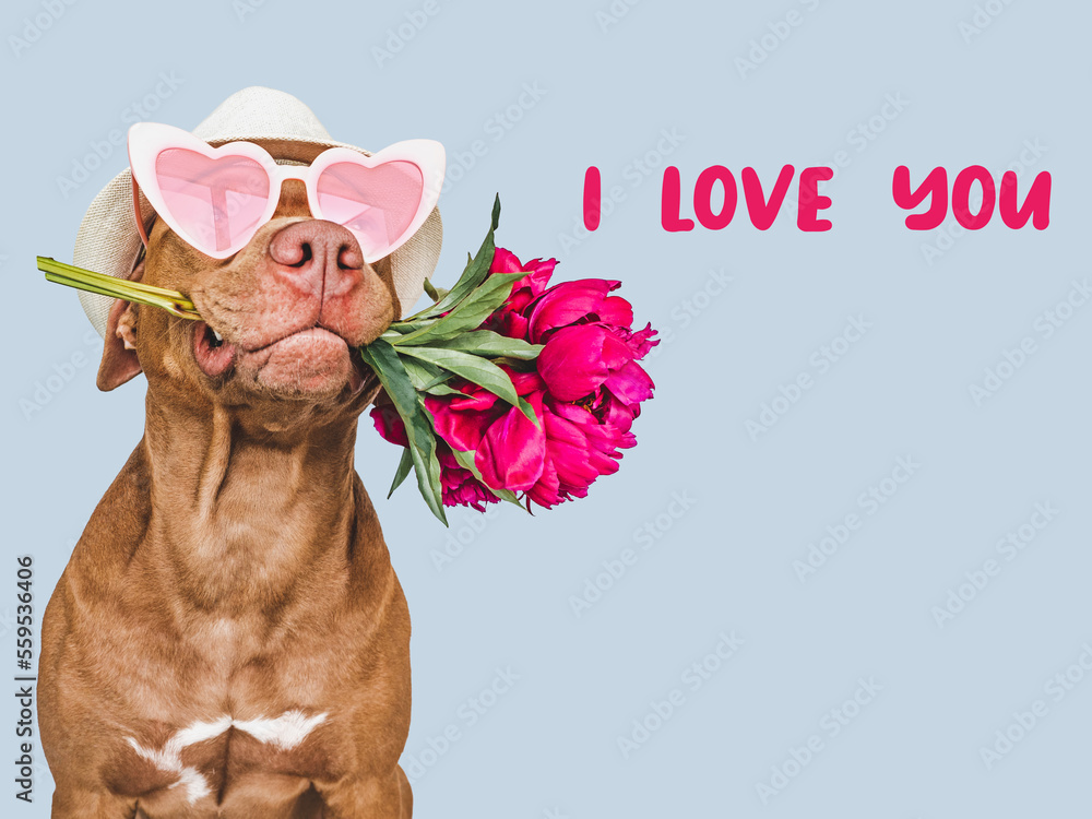 Lovable, pretty brown puppy, bouquet of flowers and inscription I love you. Closeup, indoors, studio photo. Congratulations for family, loved ones, relatives, friends and colleagues. Pet care concept