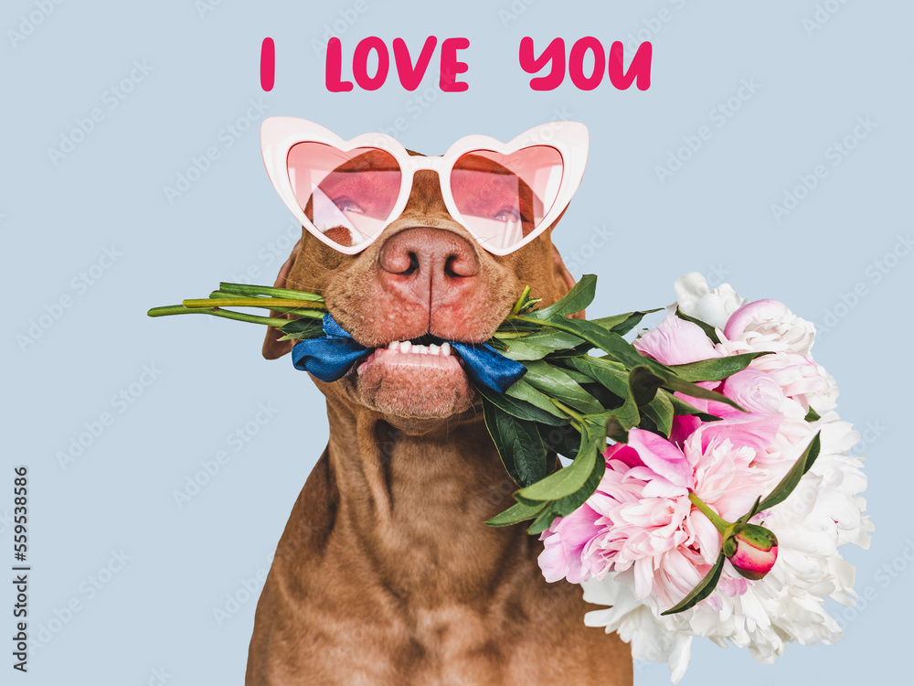 Lovable, pretty brown puppy, bouquet of flowers and inscription I love you. Closeup, indoors, studio photo. Congratulations for family, loved ones, relatives, friends and colleagues. Pet care concept