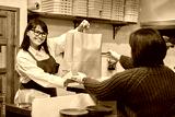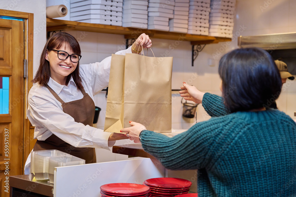 Woman restaurant worker issuing an order for takeaway food in paper bag