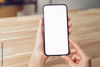Hand holding digital smartphone mockup of blank screen. Take your screen to put on advertising.