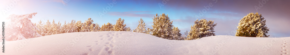Sunrise in the snowy wonder forest in winter.
