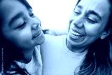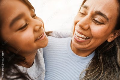 Happy latin mother and daughter having fun together outdoor - Family love and lifestyle concept - Focus on mom face