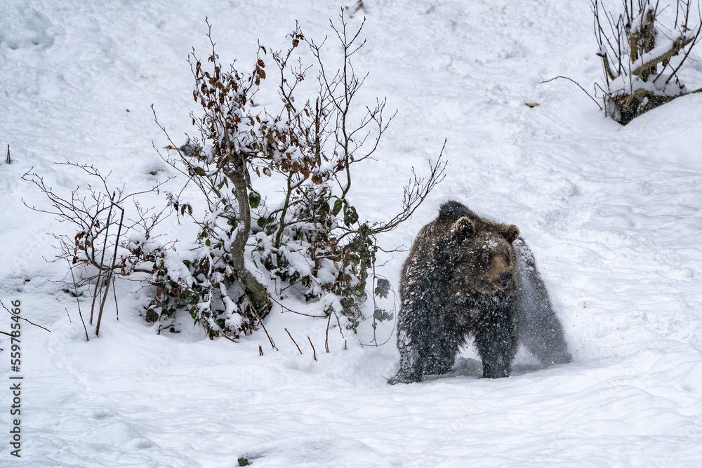 Brown Bears standing while snowing in the snowy winter forest