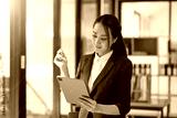 Attractive smiling Asian businesswoman standing holding tablet working and recording work details in office.