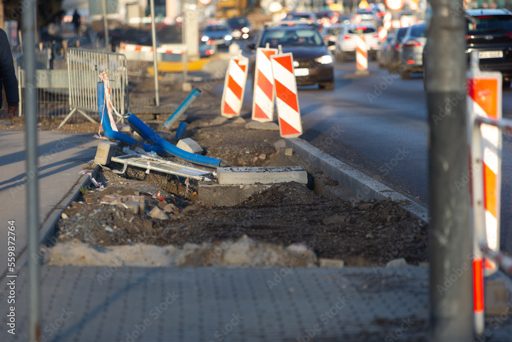 Wejście do kanalizacji kablowej podczas budowy z ulicy. Kanał telekomunikacyjny podczas budowy z ulicy. Uliczna studzienka podczas budowy