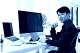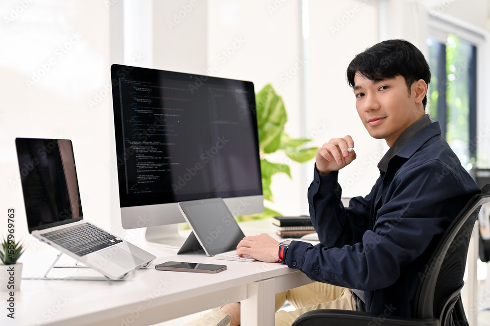 Smart Asian male web developer sits at his modern office desk, smiling and looking at the camera.