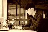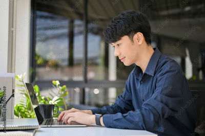 Professional Asian businessman using laptop, typing on notebook keyboard at his office desk.