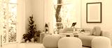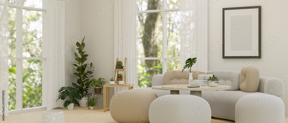 Modern contemporary white living room with comfortable couch, coffee table, indoor plants