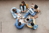 Study, laptop and group of students on floor in project, research or planning, brainstorming and teamwork. Notebook, education and top of university student, friends or people collaboration in school