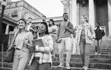 Diversity, students and walking on university steps, school stairs or college campus to morning class. Smile, happy people and bonding education friends in global scholarship opportunity or open day